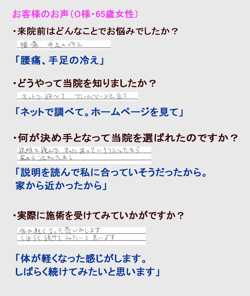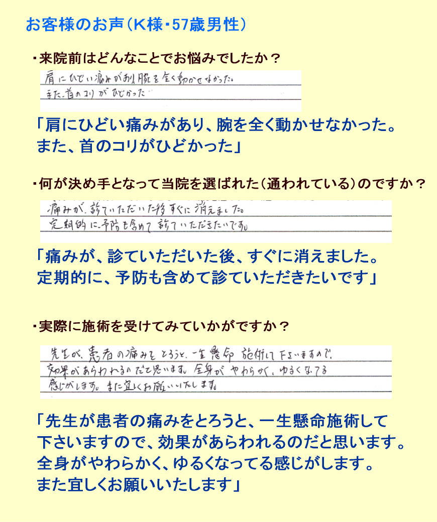 - 「その時々の症状によって施術してくださる。先生のお人柄にひかれる」(K.W様・58歳女性)